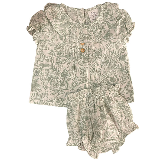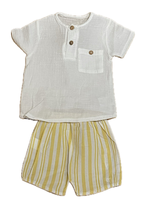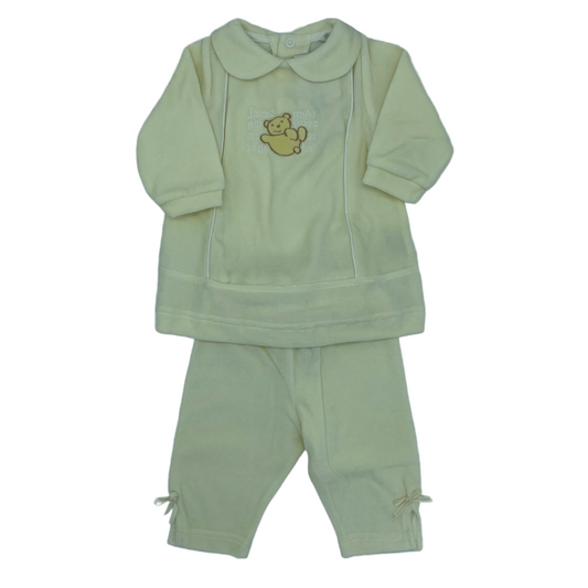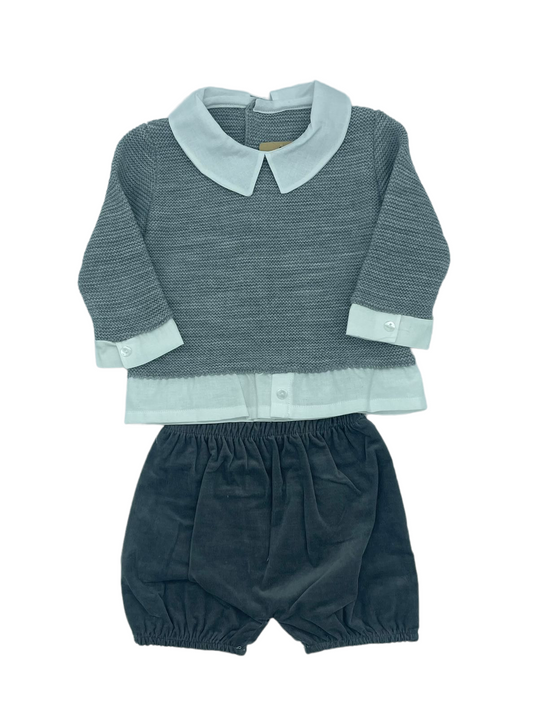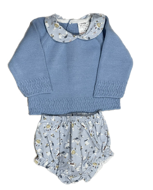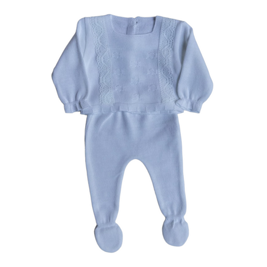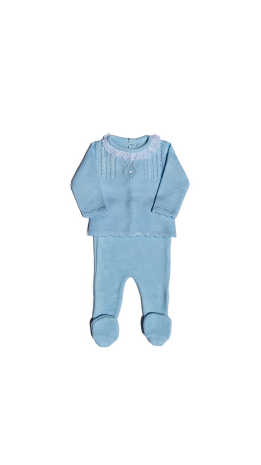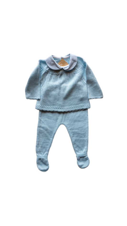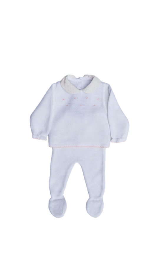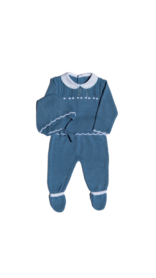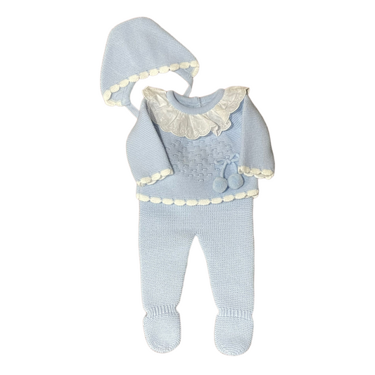 Conjunto de punto tres piezas con cuello olán y moño con pon-pones